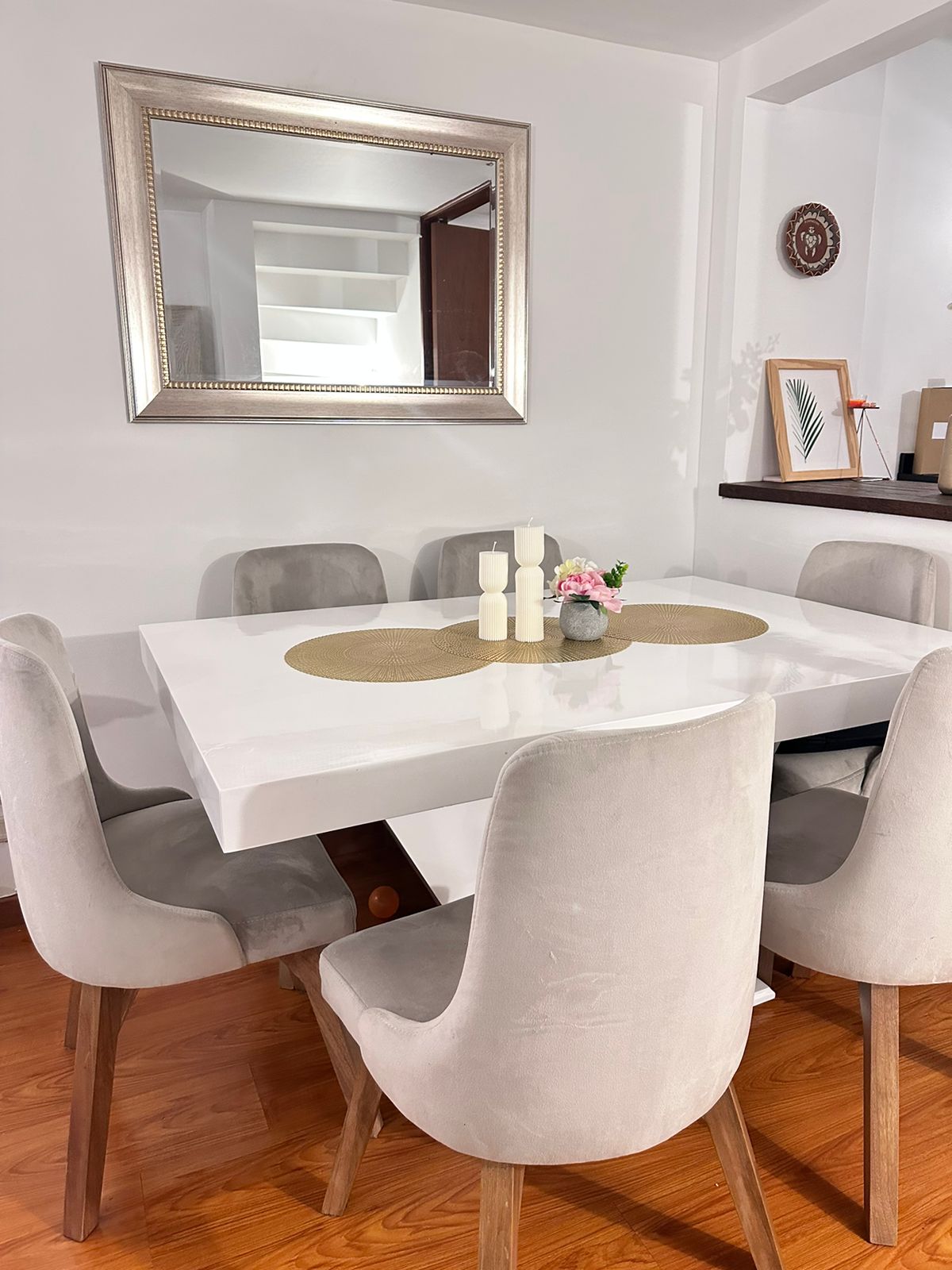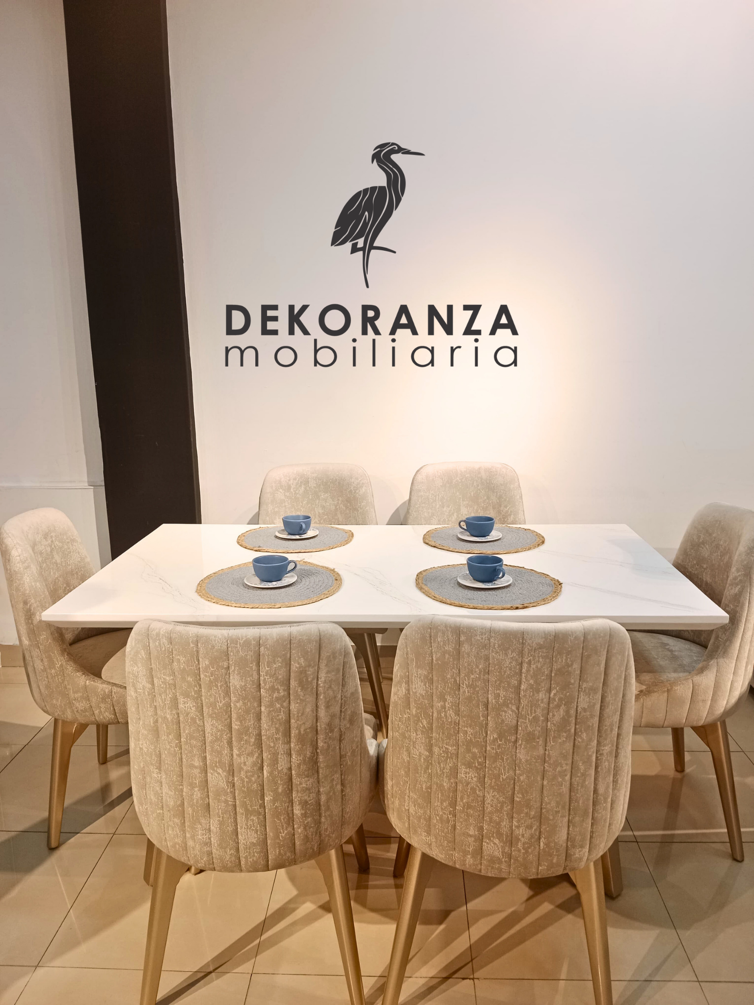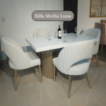 Elegante comedor compuesto por mesa pintada en poliuretano, dando una terminacion de Simulación Marmol Junto con sillas de Lujo que puedes escoger de acuerdo a tu estilo
