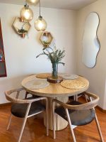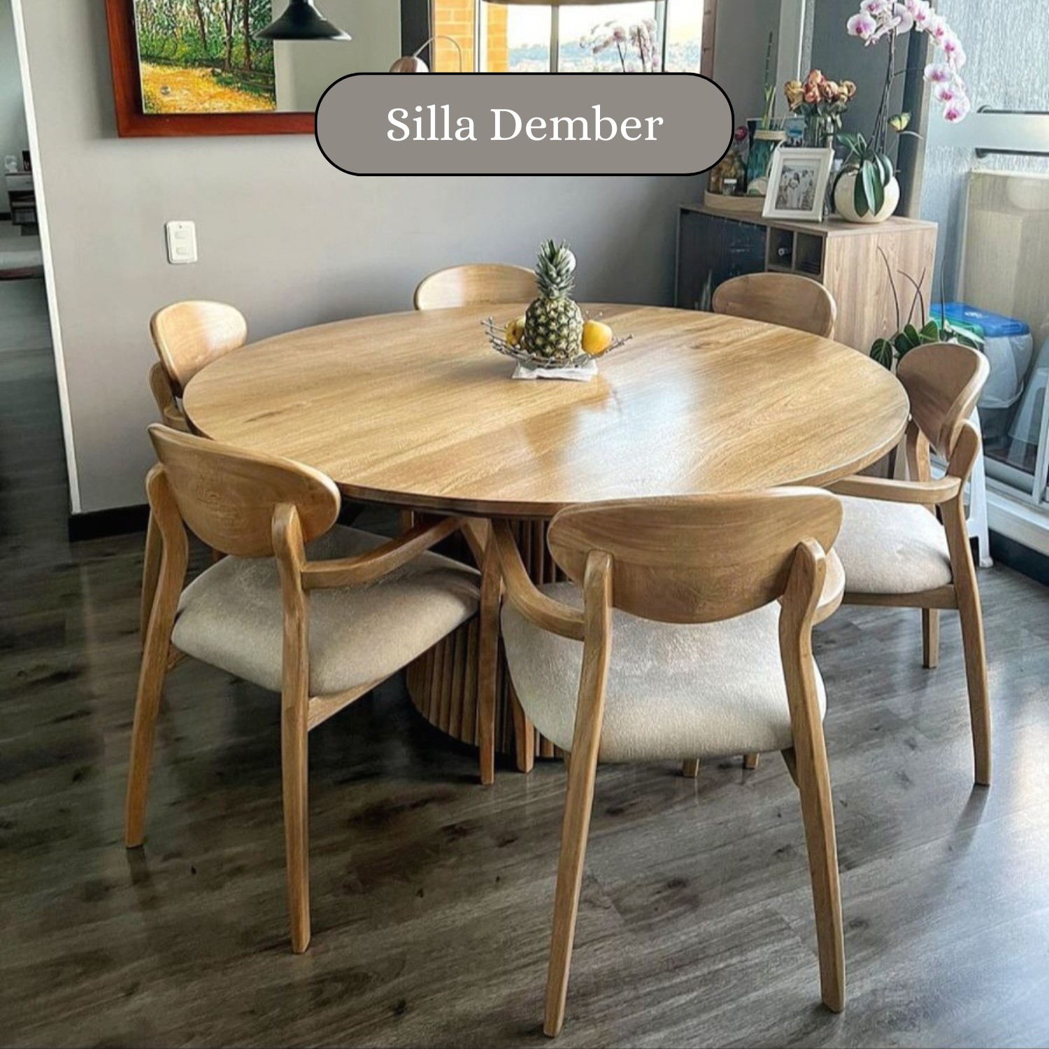 Vive la naturaleza en tu hogar Este comedor está compuesto por mesa de 1.10m en madera flormorado maciza y Sillas de comedor que puedes escoger segun estilo preferido en la misma madera.